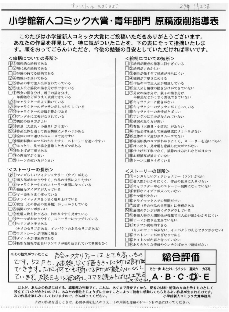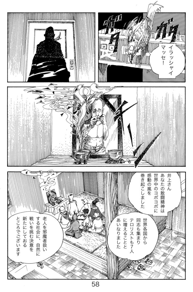 テロリストはヨボヨボ<後編2> 必死に、真面目に現実と戦っているヨボヨボを嗤うな!ガキども!しかしだけれども・・・・ヨボヨボ、野良猫に二度見される。 未分類 X Facebook はてブ Pocket LINE コピー 2024.03.042025.11.23 井上忠則 85歳 川口慎二 80歳 宇都宮盛夫(隊長) 88歳 6月19日、オリエンタルホテル鳳凰の間。 テロリストはヨボヨボ 終わり 投稿時の小学館新人コミック大賞の添削指導表です